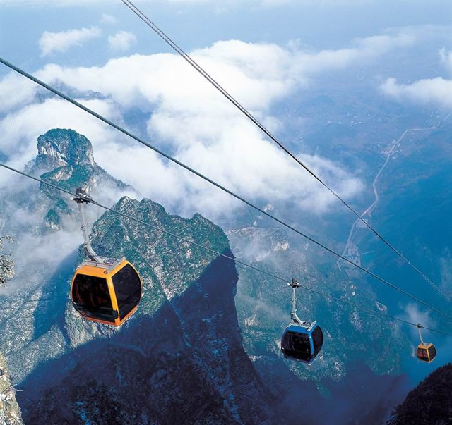 ②、張家界天門(mén)山索道為全世界最長(zhǎng)的觀光客運(yùn)索道,索道線路斜長(zhǎng)7455 米,索道運(yùn)行速度為每秒 6 米,單程運(yùn)行時(shí)間約28分鐘。上、下站水平高差1279米主要設(shè)備均由法國(guó)POMA公司原裝進(jìn)口,索道鋼繩來(lái)自于法國(guó), 98 個(gè)吊廂來(lái)自瑞士 CWA 公司,單個(gè)造價(jià)高達(dá) 20 萬(wàn)元人民幣。有嚴(yán)重心臟病或恐高癥等患者不建議乘坐;