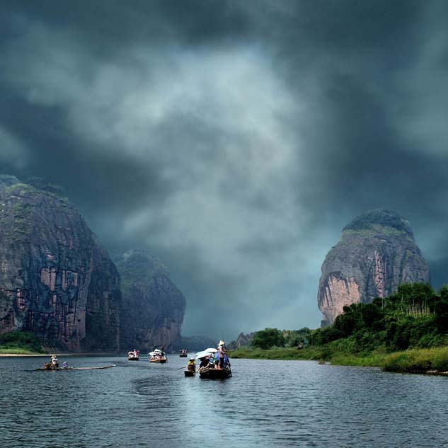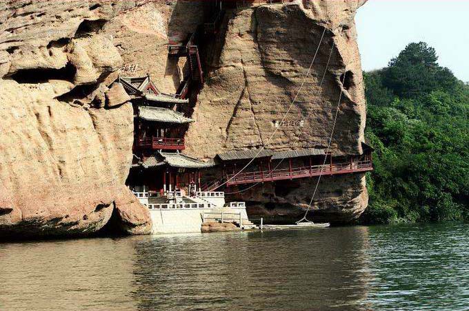 水巖在旱仙巖北面,靠上清河兩岸,因臨水而名,以碧水丹山而聞名遐邇,主體在西岸。要主景點有古棧道遺址、飛云閣、棋盤石、“仙女獻花”、仙梳石、金鐘峰、仙勺石、雌雄石等。怪石奇巖,滿山紛陳,隨處是景,目不暇接。從龍虎山莊附近乘船行不遠,對岸即是水巖,只見崖壁貼岸,陡立如屏,古樹橫生,藤蔓垂掛,山崖上古棧道遺址依然存在。在崖壁上有許多名人題刻,如“玉壁凌空”、“半天仙跡”、“神仙可接”等。至一峽口上岸,左側(cè)即絕壁獨立的“仙女獻花”。沿山徑上山,一路美景不斷。對岸亦是高峰聳立河邊,上清河蜿蜒中間,青山碧水,幽景迷人。
