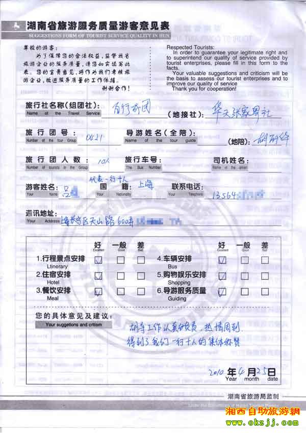 2010年4月21號上海呂小姐10位張家界鳳凰旅游質(zhì)量反饋