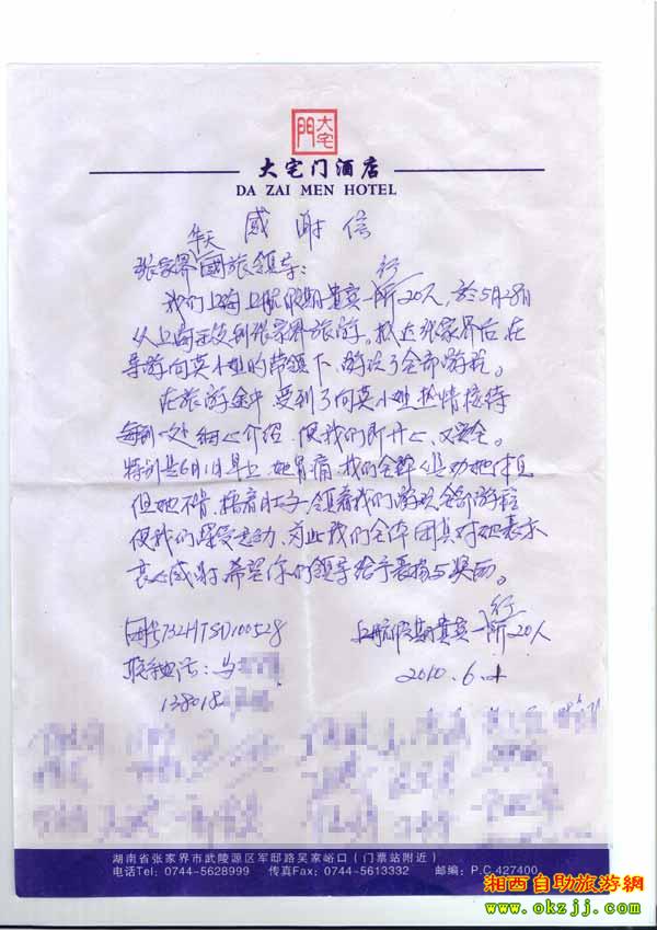 - 游客夏先生為表揚(yáng)導(dǎo)游李姣姣寫來表揚(yáng)信致我張家界... [14811]