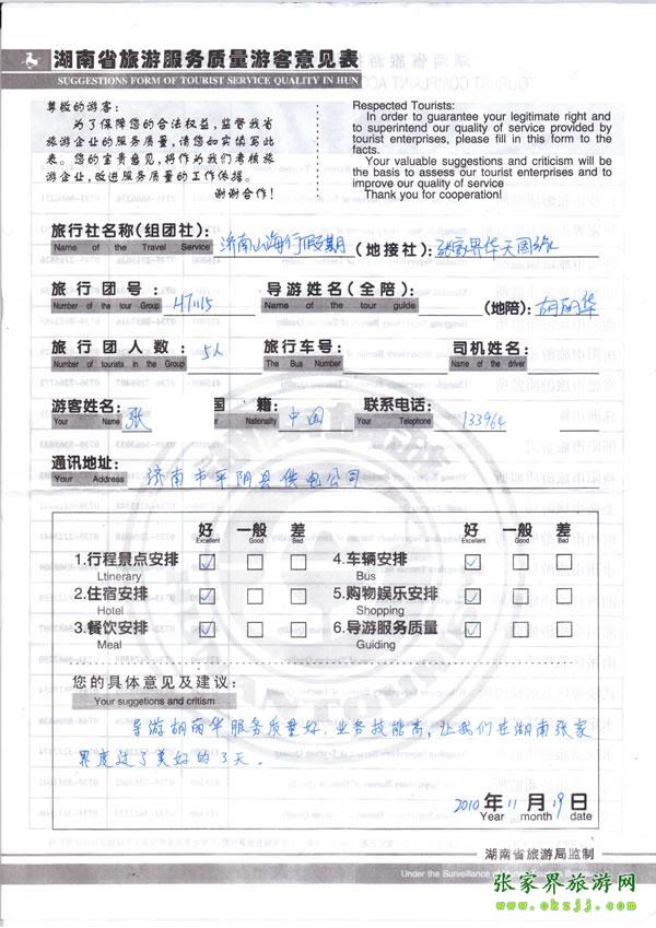 2010年11月15日張小姐一行5人評(píng)價(jià)導(dǎo)游優(yōu)