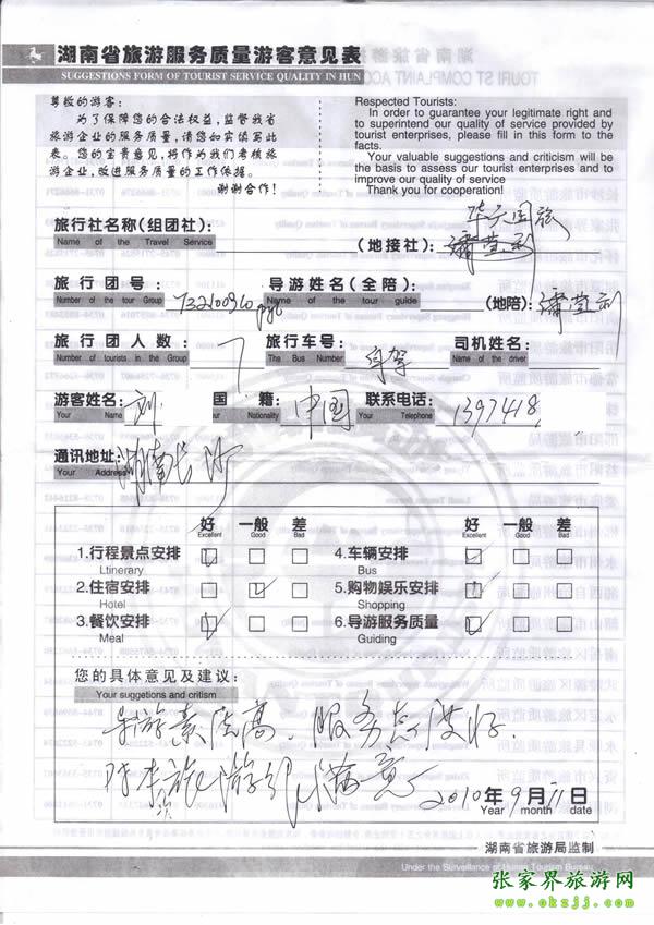 2010年9月10日劉先生對導(dǎo)游的素質(zhì)高,態(tài)度好,很滿意