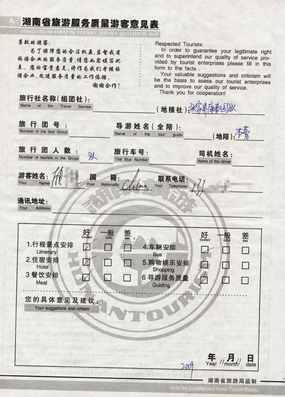 2009年11月11日顧先生一行8人旅游接待質量反饋單: