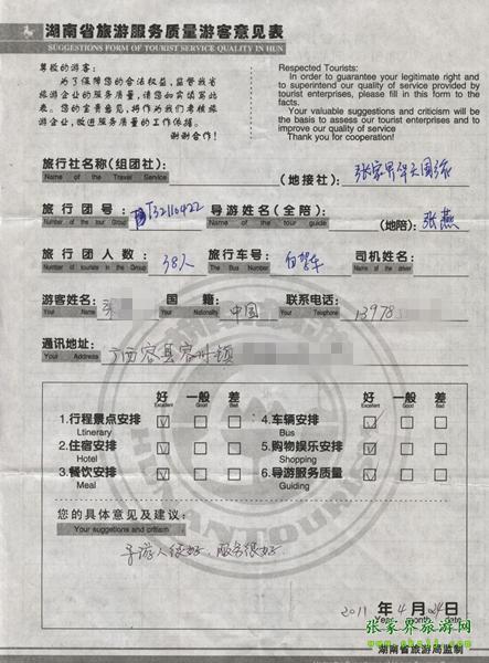 2011年4月24日梁小姐一行38人旅游質(zhì)量反饋:導游人很好,服務很好